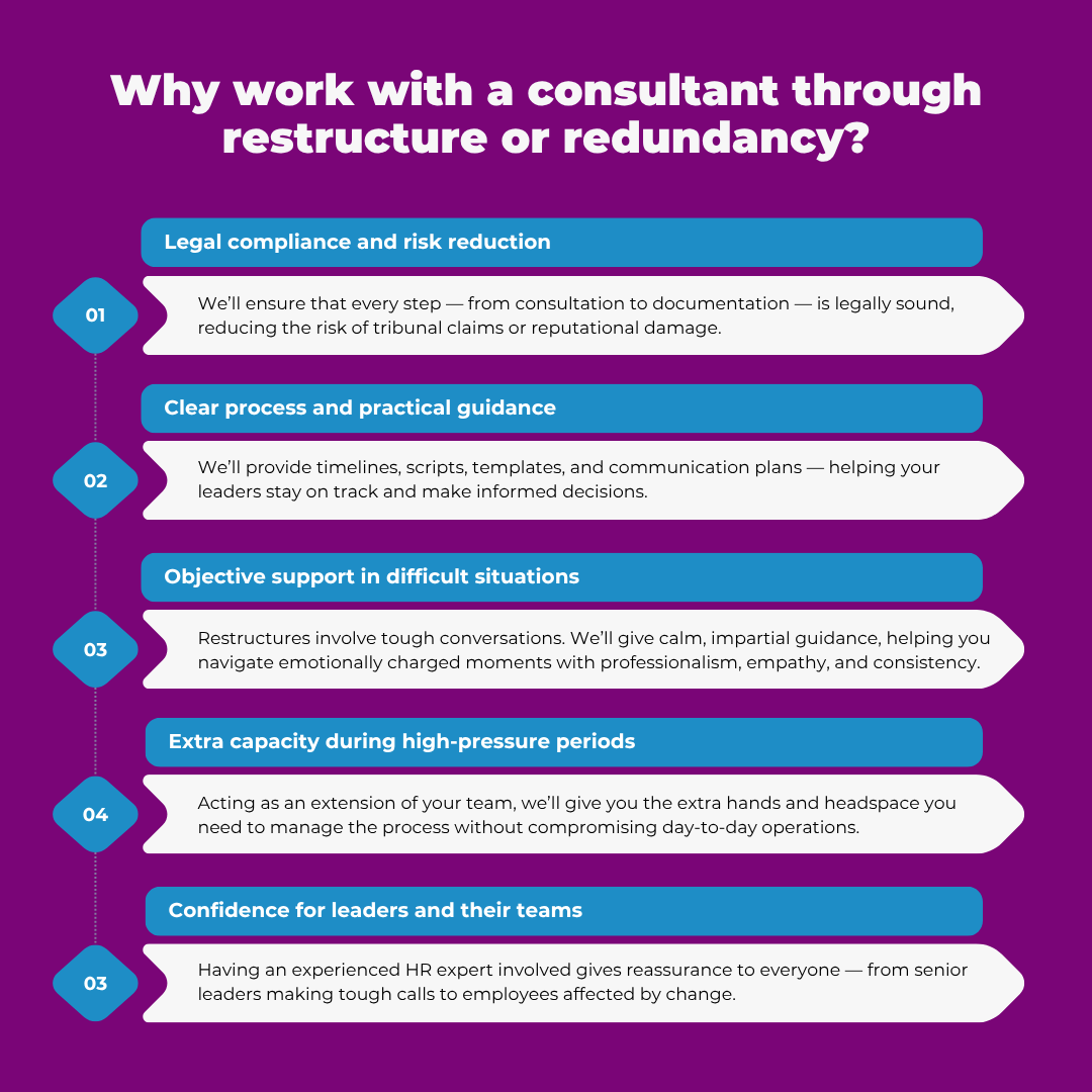 Sometimes businesses need to change — whether to remain competitive, manage costs, or adapt to new markets. Whether you’re restructuring, resizing, or closing a part of your business, Ambition HR provides experienced, hands-on support to help you manage restructure and redundancy processes lawfully and respectfully.